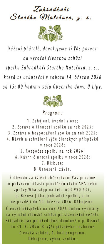 Spolek Zahrádkáři Starého Mateřova, z. s. Vás srdečně zve na výroční členskou schůzi, která se koná 14. března 2026 od 15:00 hodin v Obecním domě U Lípy. Na programu schůze jsou zprávy o činnosti a hospodaření spolku, návrh členských příspěvků a rozpočtu na rok 2026, a další důležité body. Diskuse a závěr schůze umožní účastníkům sdílet názory a návrhy. Prosíme o potvrzení účasti - SMS na tel.: 603 990 637