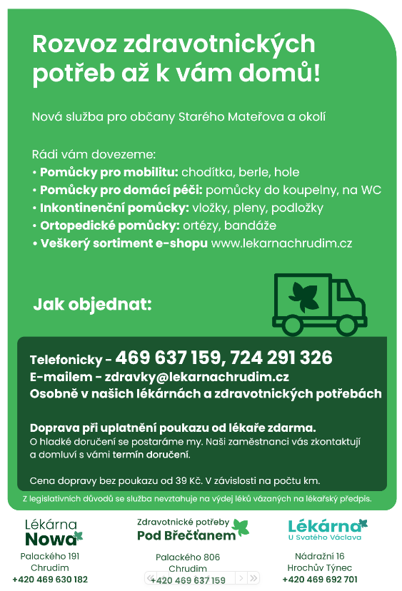 Z toho důvodu jsme se rozhodli rozšířit zóny rozvozu v rámci dlouhodobě poskytované služby, která pomáhá obyvatelům menších měst a obcí řešit právě tento problém. V rámci této služby nabízíme rozvoz nejen volně prodejných léků, ale především zdravotnických potřeb. Při uplatnění tištěného nebo elektronického poukazu od lékaře (například na inkontinenční, ortopedické či podpůrné prostředky) budou mít občané dopravu tohoto často objemného zboží zcela zdarma.