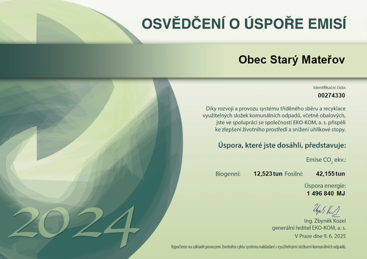 Na přiloženém Osvědčení jsou uvedeny výsledky za rok 2024, kterých jsme dosáhli v naší obci, a tím přispěli ke zlepšení životního prostředí a snížení uhlíkové stopy.