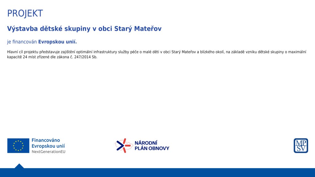 Projekt Výstavba dětské skupiny v obci Starý Mateřov je financován Evropskou unií.